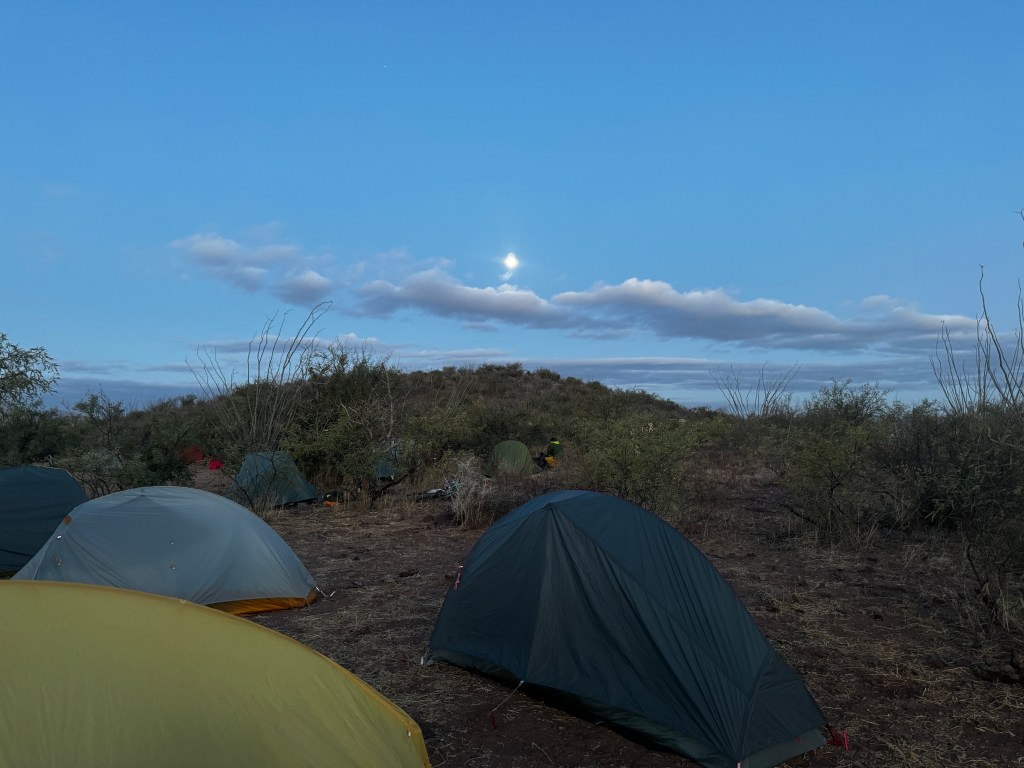 In the long wait, I got to finally sit in community with some of the cyclists I hadn't had a chance to talk with the whole event, due to differences in pacing and established pods, if there were such a thing. From there, with full bellies, we rode to a gas station for water and final snacks bar in the shape of a giant steer head, and from there it was a short ride up hill to the campsite, a dispersed and undeveloped plot of public land near the Kitt Peak National Observatory. The Komoot crew was already there with a truck bed full of cold beverages and snacks, camp fire ablaze. While we didn't go up to the Observatory (a few brave and strong riders did), I went for a walk along the dirt road to appreciate the full moon rising swiftly from behind the mountains. I needed a bathroom break and was careful to step in another's footsteps to not further disrupt the cryptobiotic soil. Years ago, living in a travel trailer with my ex-husband, we found ourselves in Tucson for a few months, working the Tucson Gem Show. I almost lost my lid on a woman complaining that the desert was a void where nothing lived. It is so wildly alive in ways we can't comprehend. There are whole worlds of species on such a different scale of size from us that we cannot comprehend one another. Occasionally, a boot crashes down, like an earthquake splitting the planet open. But hopefully it won't be my boot.